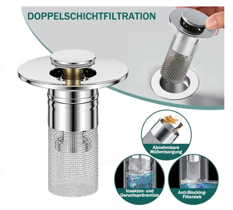 Das aufklappbare Ablauffilter-Design kippt herkömmliche und unpraktische Ablaufmethoden (wie z. B. ein grundlegender Hahn mit Kette) um! Sie können zwischen den beiden Modi umschalten, Stopfen (Wasserspeicherung) und Filter (Wasserentlastung), ganz einfach, indem Sie die obere Abdeckung leicht drücken.