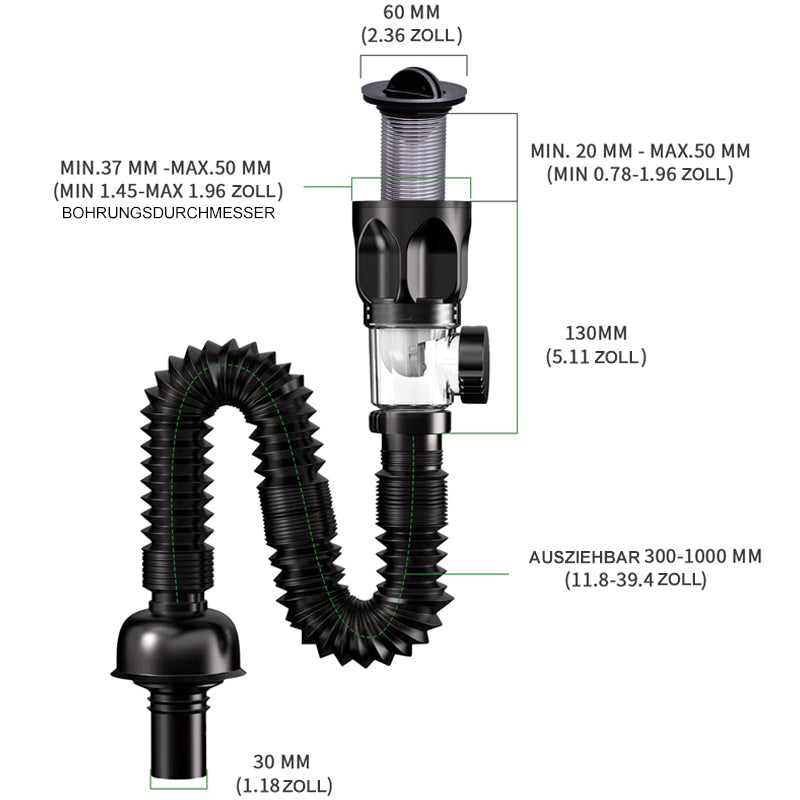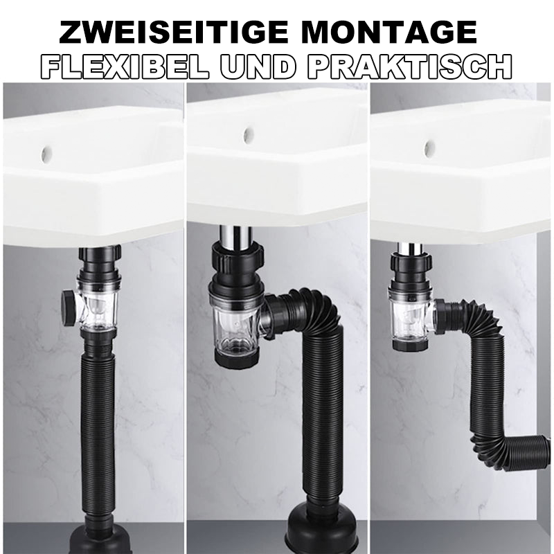 Das Abflussrohr-Kit ist mit einem verstopfungsfreien Abflussstopfen ausgestattet, der Haare und Feinstaub auffängt und verhindert, dass sich der Abfluss verstopft.