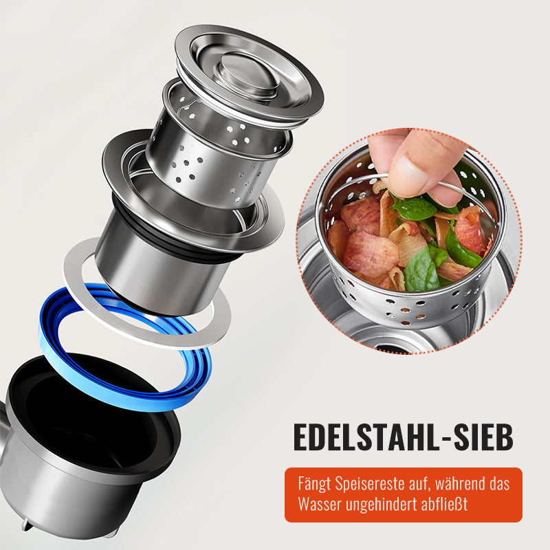 EDELSTAHL-SIEB – Das robuste Sieb hält Speisereste zurück und lässt Wasser ungehindert abfließen, um Verstopfungen vorzubeugen.