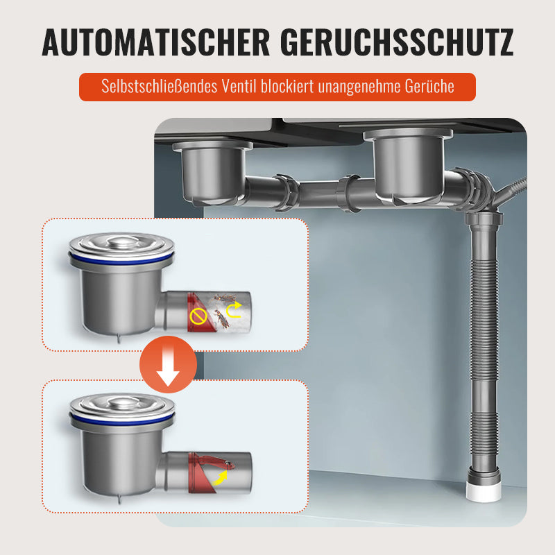 GERUCHSSCHUTZ – Das eingebaute selbstschließende Ventil verhindert automatisch, dass unangenehme Gerüche aus dem Abfluss in die Küche gelangen. Kein manuelles Eingreifen nötig.