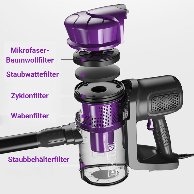MEHRSTUFIGE FILTRATION FÜR SAUBERERE LUFT – Dieser Staubsauger ist mit einem mehrschichtigen Filtersystem ausgestattet, das eine höhere Sauberkeit und verbesserte Luftqualität gewährleistet. Die verschiedenen Filtrationsstufen erfassen feine Staubpartikel, Allergene und mikroskopisch kleine Ablagerungen und verhindern, dass sie wieder in die Luft abgegeben werden.